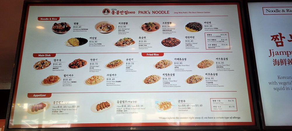Paik's Noodle: Hong Kong Ban Jum 0410 offers a unique blend of Chinese and Korean cuisine in Los Angeles. The menu features favorites like jajangmyeon, sweet and sour pork, tangsuyuk, and more. Customers rave about the delicious flavors and generous portion sizes. The ambiance is described as spacious and not too busy, making it a great spot for a relaxed meal. The service is fast and efficient, with the convenience of ordering on tablets. The standout dishes include the jajangmyeon with perfectly chewy noodles and the tangsuyuk with crispy batter and tender pork. The fusion of flavors and traditional recipes make Paik's Noodle a must-visit for those craving authentic Korean-Chinese comfort food in Ktown.